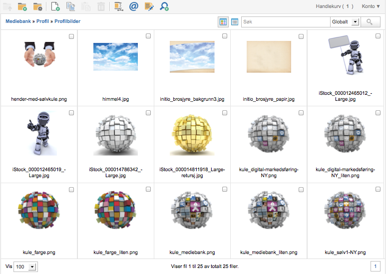 I venstremenyen kan du navigere i Mediebanken i en tremeny, og til høyre ligger visningen av bildene som ligger i mappen som velges til venstre. Over bildene ligger menyen for bildedatabasen. Den inneholder følgende: