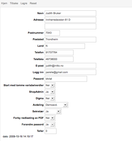 Når du redigerer en bruker, kan du under skjemaet se når brukeren ble opprettet. Tidspunktet hentes direkte fra databasen, f.eks. «dato: 2007-03-16 16:05:49».