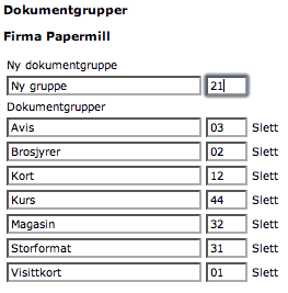 Feltet til høyre for dokumentgruppe-navnet er for sorteringskode. Hvis sorteringskode ikke er defintert vil dokumentgruppene sorteres alfabetisk.