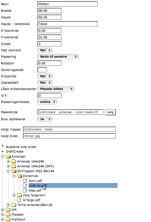 - nofit – Ignorerer høyde og bredde satt på elementet, og plasserer bildet i 1:1 ut fra det angitte x/y-punktet. Det anbefales ikke å bruke dette valget på elementer hvor brukeren kan laste opp bilder. Men admin kan ha nytte av det på enkelte dynamiske maler.