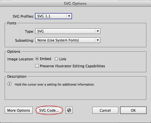 Tips: I Illustrator CC kan du også ganske enkelt bare kopiere objektet i Illustrator uten å gå via lagre som-dialogen. I utklippstavla blir dette håndtert som ren svg-kode. Og du kan derfor bare lime inn dette i svg-feltet i Corda.