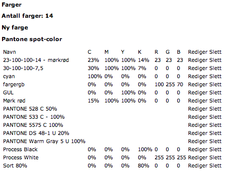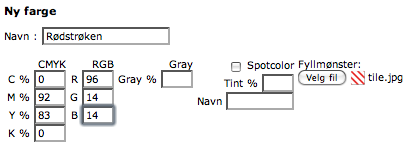 Ny farge: Definer fargen selv ved å skrive inn navn og fargeverdier. (CMYK-verdiene er fra 0-100%, RGB er fra 0-255). Skal du lage en CMYK-farge, kan du glemme RGB-verdiene og omvendt, med mindre fargen skal brukes på maler med begge fargerommene. Når du lagrer, kontrolleres fargene – hvis CMYK-verdiene er gyldig blir det en CMYK-farge, hvis RGB-verdiene er riktig blir det RGB. En farge kan være enten i det ene eller det andre fargerommet, eller den kan være i begge. (Ugyldige farger godtas ikke.)