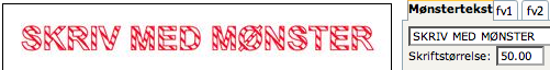 Fyllmønster: Ved å laste opp en JPEG-, PNG, eller TIFF-fil her, vil bildet brukes som farge, og fargen som angis i de andre feltene vil brukes som strek-farge. Dersom bildet er lagret med transparens, vil denne bli tatt vare på. Størrelsen på mønsteret styres av millimeter-formatet til bildefila. Mønster-bildet dupliserer seg bortover og nedover automatisk. PNG vil alltid bli brukt i 72 dpi, men jpg/tiff vil ta hensyn til dpi som er satt i bildefila. Dersom det er viktig at mønsteret har høy oppløsning, bør man derfor velge jpg.