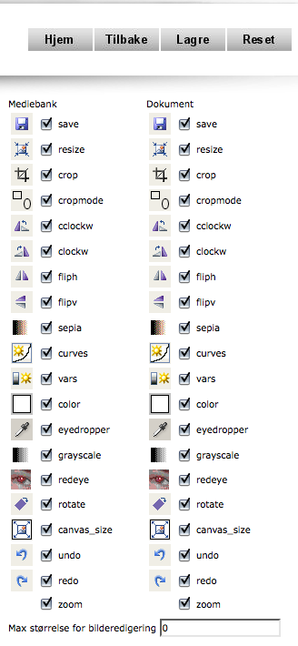 Fører til en ny side (husk å lagre ev. endringer gjort under «Eget firma» først) hvor admin kan definere hvilke verktøy som skal være tilgjengelig i NetPhoto. Verktøy kan slås av og på både for bildebehandling i Mediebanken og på Dokumenter.