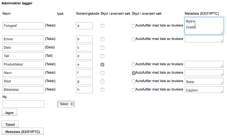 Fører til en ny side. Her kan admin sette oppog redigere tagger som skal være tilgjengelig i mediebanken eller nettbutikken. En typisk tag i mediebanken kan f.eks. være «Fotograf» eller «Fotografert dato».