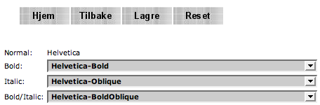 Hvert fontnavn under «Fonter» er en klikkbar lenke. Ved å klikke på den aktuelle fonten får man opp en side der man kan definere hvilken font som skal brukes dersom brukeren velger «halvfet» eller «kursiv» eller «halvfet/kursiv» (se ill.). Dersom admin ikke definerer noe her, vil det heller ikke skje noe på dokumentet som brukeren redigerer.