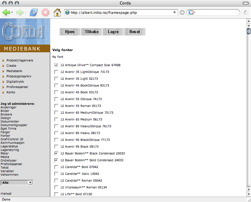 Alle fontene som brukes i Corda må ligge på webserveren. Hva du aktiverer her, bestemmer hva slags fonter du kan velge mellom når du f.eks. skal velge font på et tekstfelt. Og også de fontene du velger i CordaFont-tagger.