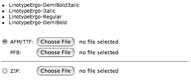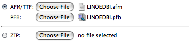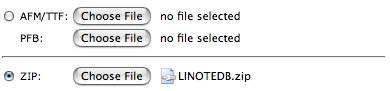 Du kan også pakke alle font-filene i en zip-fil. Hvis du laster opp Type1-fonter, må zip-fila inneholde både afm- og pfb-filene av alle fontene. Systemet finner da alle kombinasjonene av afm- og pfb-filer fra zip-fila, og lister disse opp. Finnes det duplikater, får du mulighet til å erstatte med den nye, eller ignorere. Du kan også velge bort de snittene du ikke vil importere likevel.
