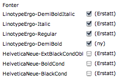 Fonter-siden vil liste opp alle fonter i systemet. For å aktivere en font, sett kryss ved fonten(e) og klikk «lagre».
