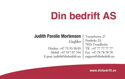 Dette er den vanlige PDF-fila. Dersom du endrer navnet på PDF-fila fra pdf4899.pdf til nob4899.pdf vil du laste ned ei PDF-fil som kun inneholder elementene som i malen/dokumententet er satt til «Fast Element: Ja», f.eks. den svarte teksten på visittkortet.