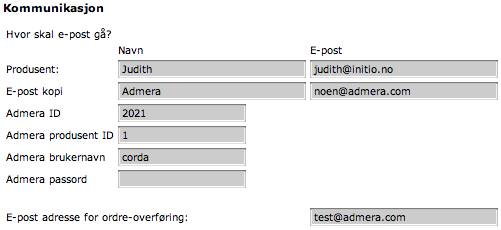 Dersom firmaet har CrafiControl ID eller Admera, trenger du en e-postadresse for ordreflyt. Denne får du fra Initio.