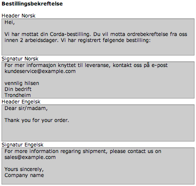 For at en slik bekreftelse skal sendes, må disse feltene under kommunikasjon være utfyllt på aktuelt språk. E-postadressen som settes som avsender er firmaadmins e-postadresse.