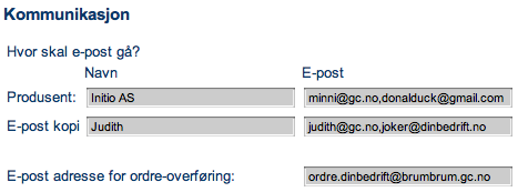 Her bestemmer du til hvilken e-post alle bestillingene skal gå. Det er mulig å ha flere mottakere i produsent-feltet ved å skille med komma. Både feltet for navn og feltet for e-post må fylles ut.