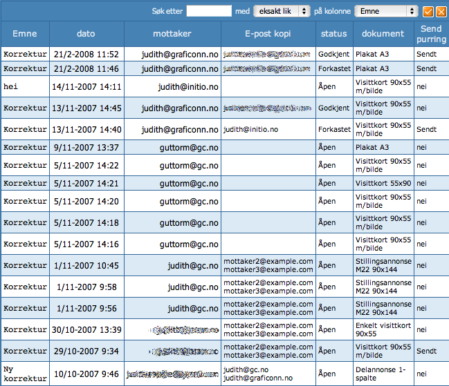 I oversiktstabellen er det mulig å søke etter tidligere korrekturer ved å benytte søkefeltet øverst. På den måten kan man for eksempel søke etter alle korrekturer som er sendt til en mottaker som har en e-postadresse som inneholder «firmanavn.no». Eller bare vise korrekturer som har blitt Forkastet.