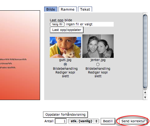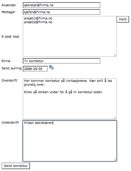 Når den som bestiller har trykket på «send korrektur»-knappen, får han opp en side med felter for sender, mottaker(e) og innhold: