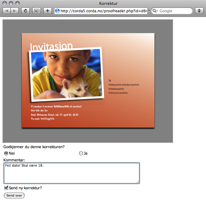 Når mottakter klikker på lenken i e-posten han har fått, kommer han til en side hvor PDF-filen vises i et visningsvindu (se illustrasjon «Se korrektur» til høyre). Mottaker har mulighet til å godkjenne eller forkaste, skrive en kommentar og be om ny korrektur.