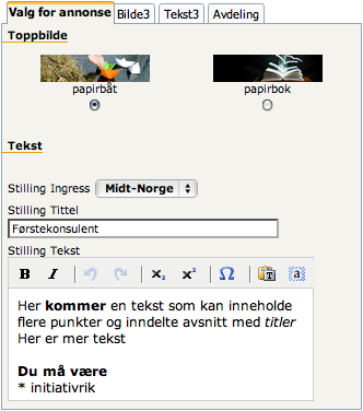 For annonser. Dette valget kommer kun frem dersom denne modulen er slått på for firmaet, ellers ikke. «Nei» gir vanlig bestillingsrutine for brukeren, mens «ja» gir brukeren anledning til å velge type media/innrykningsdato. Dersom malen er en annonsemal, vil brukeren finne dokumentet under annonsemenyen til venstre. Se Media/Annonsemodul.