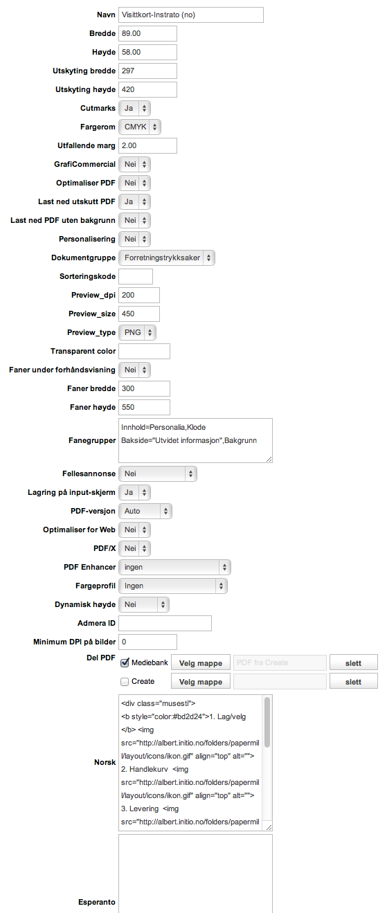 Det er på malen du bestemmer alle de viktige egenskapene, slik som størrelse, fargerom etc. Malen har følgende egenskaper: