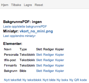 Her kan man laste opp en PDF som alltid legges i bakgrunnen når systemet genererer PDF. Merk at denne PDF-en ikke blir skalert og tilpasset formatet på malen, men blir lagt inn på bakgrunnen så stor som den er.