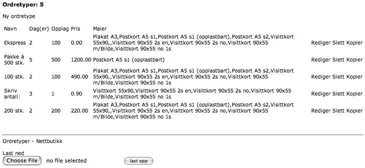 Her kan du laste ned ordretypene under «Produkt/lagervare» som tab-separert tekstfil, redigere denne og laste den opp igjen.