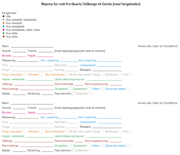I starten kan du f.eks. benytte et enkelt skjema som inneholder felter for alle opplysninger du trenger til de forskjellige elementene tekstfelt, tekstblokk, bilde eller boks – til du er fortrolig med hvilke mål du trenger. De erfarne fører leser av de målene de trenger direkte fra InDesign.