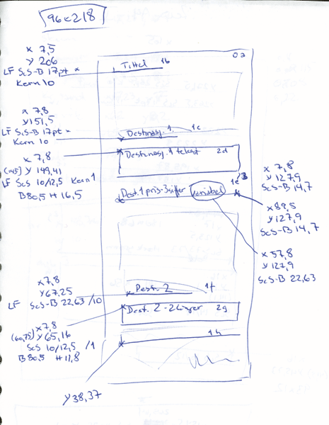 - Sett 0-punktet i dokumentet nede til venstre. Noter alle mål på bilder/tekst og egenskaper som sortering og dybde. Lag deg enten en skisse av dokumentet, eller, etterhvert som du blir mer erfaren, finn ditt eget system for å skrive ned alle mål du trenger (eksempler til høyre).