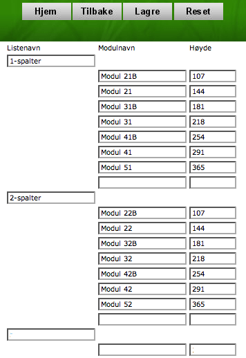 Modulstep styrer kun høyden på en dynamisk mal. Bredden settes på malen og opererer helt uavhengig av denne listen. Det er i teorien ingenting i veien for å bruke listen «1-spalter» på en 3-spalte-mal hvis modulhøydene er de samme. Men hvis navnet som angis i «modulnavn» f.eks. viser til «Modul 31», vil dette bli misvisende for brukeren.