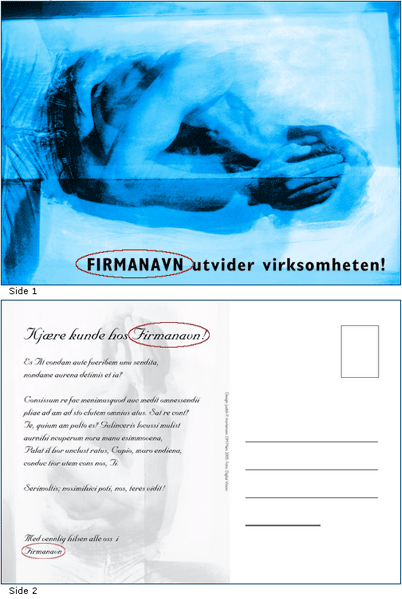 Da vil brukeren fylle ut feltet «Firmanavn» én gang, men resultatet kan bli som illustrasjonen til høyre der Firmanavn har kommet inn på tre forskjellige plasser, med tre forskjellige skriftsnitt.
