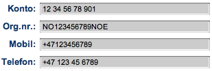 Her har vi fire måter å bruke formatering på. Kontonummer, organisasjonsnummer, telefon- og mobilnummer. Se hva som skjer med det som skrives inn i input-feltene på illustrasjonen til høyre, og resultatet under.