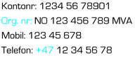 <CordaFont color="Process Black">%NO%{%Org.nr.:%}NO ### ### ### MVA