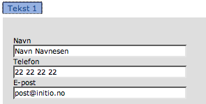 | Navn: Tekst 1 Verdi: {{Navn}}{{$Telefon$}}{{$E-post$}} Sorteringskode: aa |