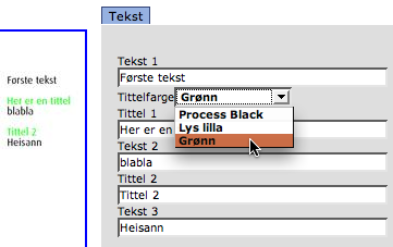 Nå vil brukeren få en droppliste hvor han får velge farge på titlene, og både tittel 1 og tittel 2 vil få samme farge. Hvis de skal kunne ha forskjellige farger lager du en dropplistevariabel til (f.eks. «Tittelfarge 2») med samme alternativer som den første.