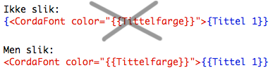 OBS! Du kan ikke ha en variabel inni en annen variabel. Det vil si at en variabel som skal definere fontegenskaper for variabelen som kommer etter, ikke kan ligge inni den variabelen, men må ligge foran.