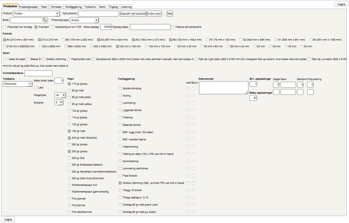 Konkrete produkter settes opp under første fane, mens alt av grunnlagspriser og -materiell må settes opp under de andre aktuelle fanene. For at produktet skal være tilgjengelig for en kunde må produktet både være «publisert» og gjort tilgjengelig for kundes firma.