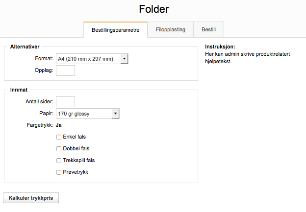 Kunden som skal bestille et produkt, skal kun ha de valgene som er nødvendig for de ulike produktene. For noen produktet innebærer det kun å velge antall, mens andre krever litt flere valg. Her er et eksempel på oppsettet for et enkelt produkt, Folder: