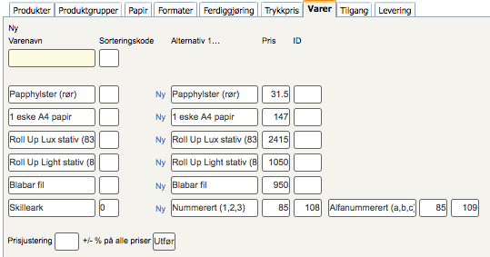 Det er mulig å foreta en prisjustering av alle priser samlet ved å angi en prosentverdi i feltet under tabellen.