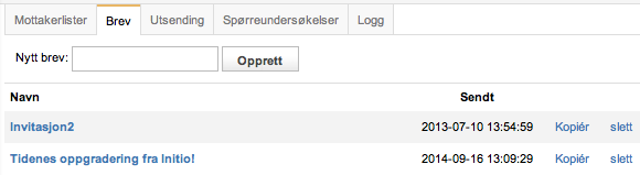 I oversikten listes alle tidligere opprettede brev opp sammen med informasjon om når det siste ble sendt ut til en mottakerliste. For mer informasjon om tidligere sendinger, og til hvilke mottakerlister brevet har blitt sendt til, se «Logg».
