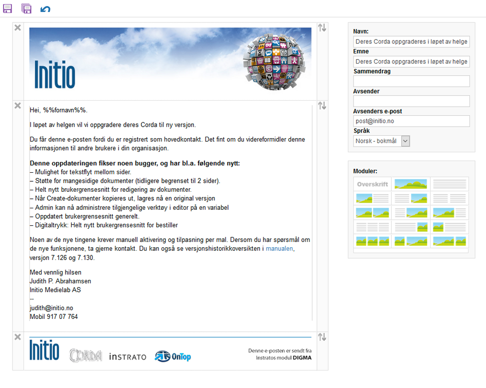Det første du vil legge merke til er panelet til høyre. Navn-feltet er navnet på brevet i Digma. Emne tilsvarer emne/subject i eposten som genereres og Sammendrag-feltet brukes om du ønsker å ha en definert "førstelinje" i eposten. Avsender kan også defineres, om man ønsker at mottaker skal se et annet avsendernavn enn selve avsenders epost.
