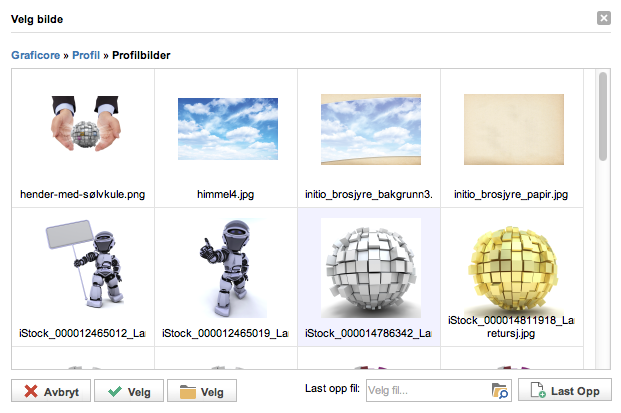 Klikk på et bildeområde for å legge til bilde. Dette åpner en filnavigerer som lar deg bla i mediebanken. Dersom du har skrivetilgang til mapper i mediebanken kan du via denne dialogen også laste opp bilde fra din PC via «last opp fil» nede til høyre.