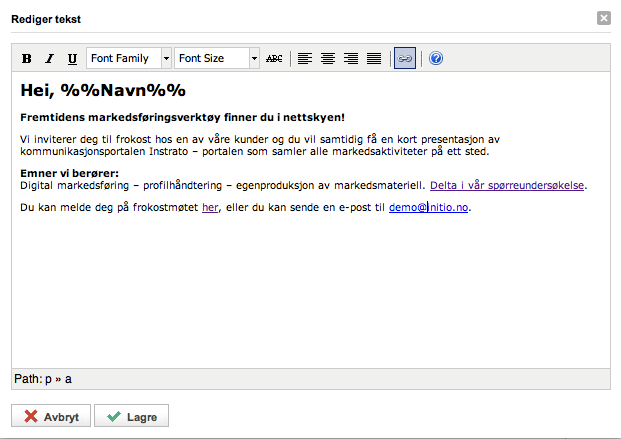 Når du klikker på et tekstområde åpnes teksten i en avansert teksteditor. Her kan du skrive tekst og velge format og størrelser. Teksteditoren har noen begresninger for å sikre kompatibilitet mot ulike e-postlesere.