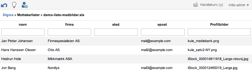 Når du bearbeider en mottakerliste i Excel før opplasting, og har tenkt å flette med bilder, må først alle bildene som skal brukes legges i en felles mappe i mediebanken. I mottakerlista må kolonneoverskriften for bildeinformasjon ha samme navn som den aktuelle mappa i mediebanken, og hver rad ha det nøyaktige filnavnet til det bildet denne mottakeren skal ha, inkludert etternavn, f.eks. «kule_sølv2-NY.png». Se eksempel.