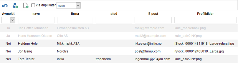 Når du er inne og redigerer en eksisterende mottakerliste, kan du vise duplikater i lista. Hak av boksen «Vis duplikater» og velg hvilken kolonne du ønsker å lete etter disse i. Hvis du ønsker å fjerne noen av duplikatene, klikk på den aktuelle raden og velg "Avmeldt".