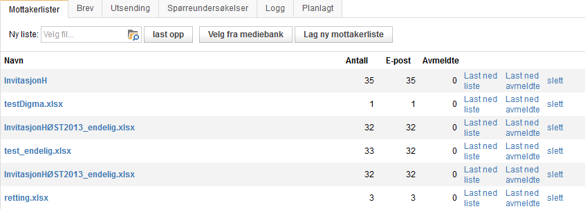 Mottakerlisten kan lastes opp direkte, lages i Digma, eller du kan importere en eksisterende fil fra mediebanken.
