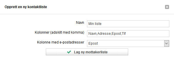 Du vil da få opp en boks hvor navn på lista, kolonnenavn og epostkolonne må spesifiseres. Skriv inn ønskede kolonnenavn adskilt med komma, og velg hvilken av disse som skal være gjeldende epostkolonne.