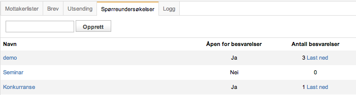 For å opprette en ny spørreundersøkelse, skriv inn et navn i feltet over tabellen og klikk «Opprett». For å redigere en eksisterende spørreundersøkelse, klikk på navnet til denne spørreundersøkelsen. Du kan også kopiere et eksisterende skjema ved å klikke «kopier» helt til høyre.