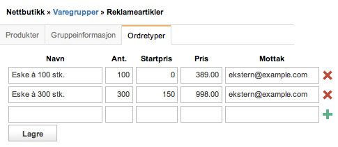 Dersom bestillling av et produkt skal gå til en tredjepart, fylles e-postadressen til denne mottakeren ut i dette feltet. Alle bestilllinger går alltid uansett til mottakerne som er angitt i admins meny «Kommunikasjon», så feltet trenger kun å være utfylt dersom det er egne tilleggsmottakere for noen produkter.