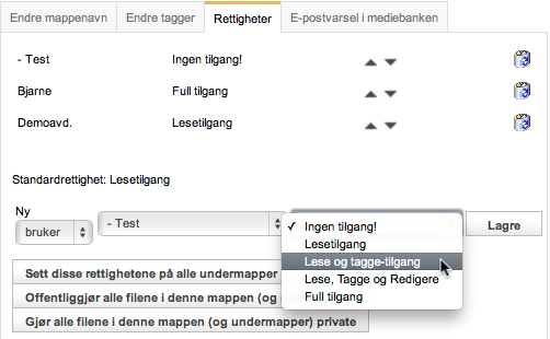 OBS: Når du redigerer rettighetene på en mappe, så mister mappen de rettighetene som er arvet fra mor-mappen. Så dersom du som sekretær har blitt gitt full tilgang til mediebanken av administrator, og så skal inn og redigere rettgheter, er det viktig at du aller først sørger for å legge til en tilgang som sikrer deg selv eller den avdelingen du er tilknyttet «Full tilgang». Hvis du glemmer dette, mister du tilgangen til å redigere den aktuelle mappen straks du legger til en annen rettighet for en annen bruker.