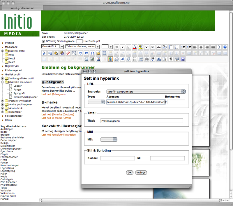 Men dersom det velges en fil i dropplisten, legges følgende tekst automatisk til lenken: «&download». Det vil føre til at et bilde blir lastet ned i stedet for å vises i nettleseren. Hvis du likevel ønsker at bildet skla vises i nettleseren, er det bare å fjerne «&download», og i motsatt fall legge det til dersom du ønsker å ha denne funksjonen på en annen lenke som ikke er lenket til Mediebanken.