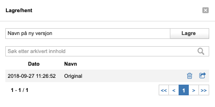 Dersom en lagret versjon med samme navn allerede finnes, vil du få beskjed om dette med mulighet til å redigere eller lagre likevel. Du vil ikke erstatte den forrige versjonen, men den legges inn som en «duplikat» og den gamle versjonen skjules i hent-lista. Sett kryss ved valget «Vis duplikater» for å vise alle versjoner som er lagret under samme navn.