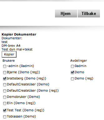 Merk den eller de dokumentene som skal kopieres og klikk på knappen. Du kommer nå til en ny side hvor du kan sette kryss både ved navnet på en avdeling for å kopiere dokumentene til alle brukerne i denne avdelingen og/eller navnet på enkeltbrukere for å kopiere dokumentene til disse.